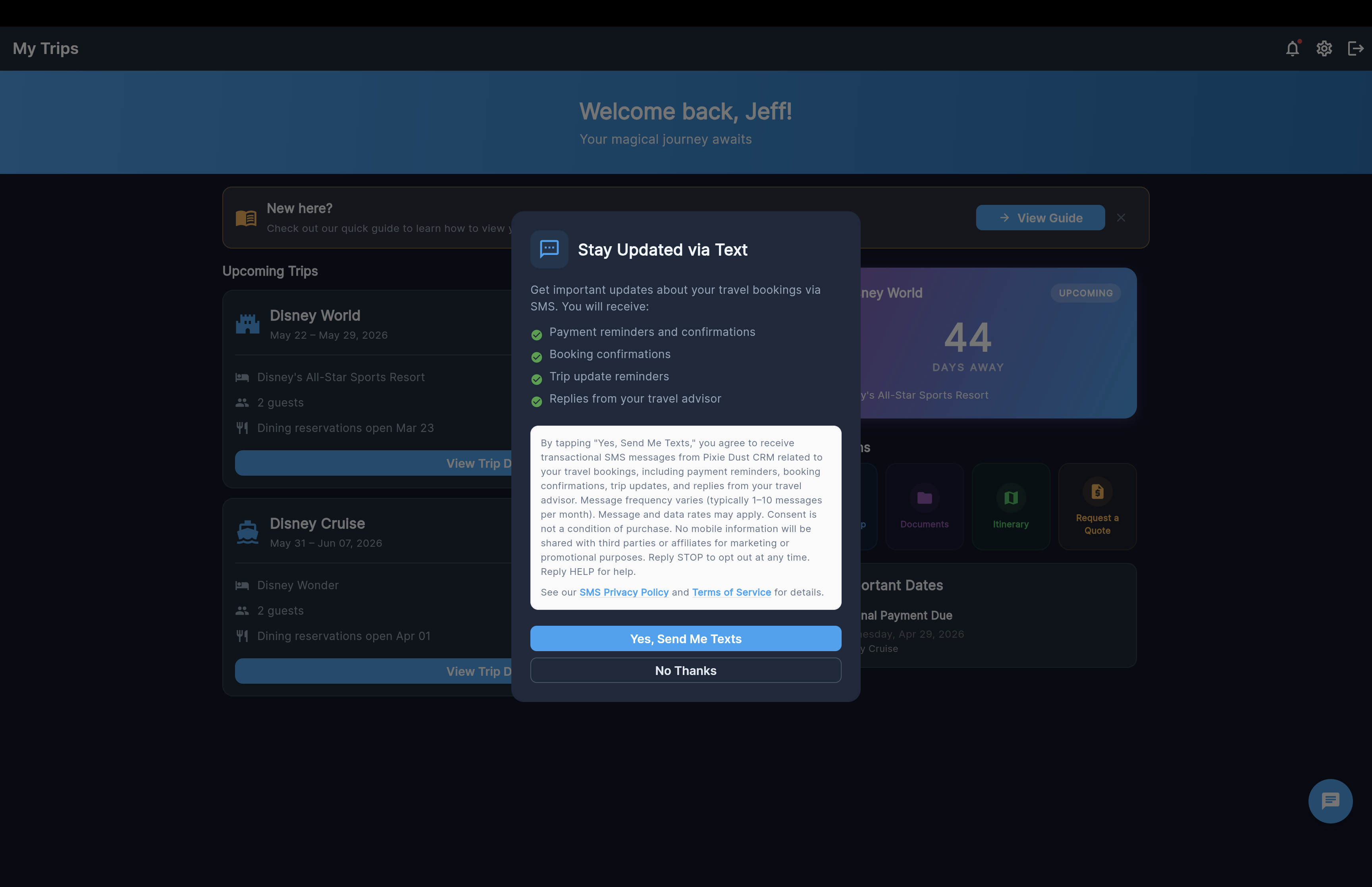Opt-in: Clients opt in to receive SMS messages through an explicit in-app prompt when they first log in to the Pixie Dust CRM client app. The opt-in dialog clearly describes the types of messages that will be sent and provides a link to our SMS Privacy Policy. Clients may also enable or disable SMS at any time through their app Settings. Opt-in is completely voluntary and is not required to use the app or receive travel agent services.