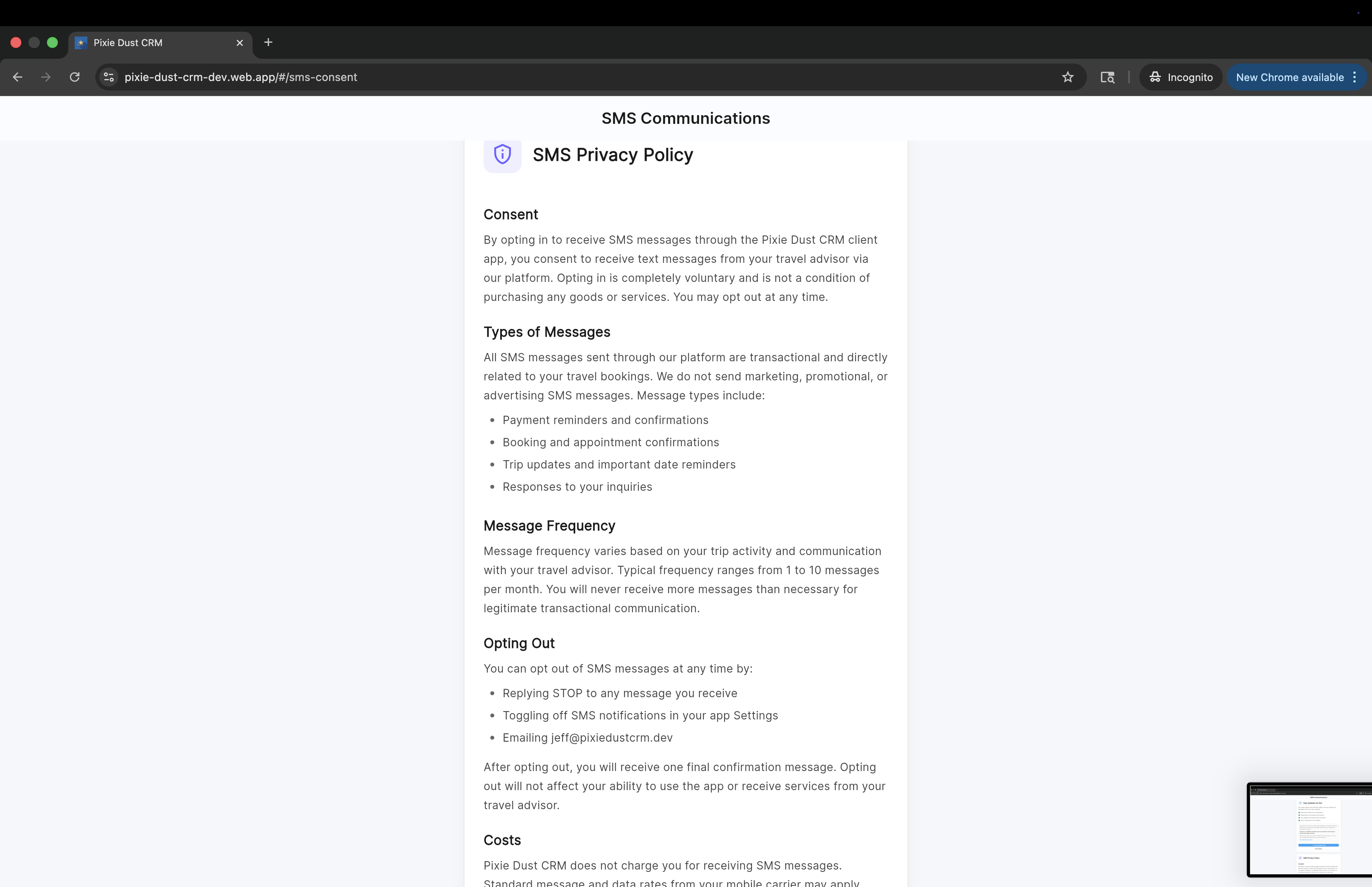 Opt-out: You can opt out at any time by replying STOP to any message, toggling off SMS in your app Settings, or emailing jeff@pixiedustcrm.dev. After opting out, you will receive one confirmation message and no further SMS messages.
