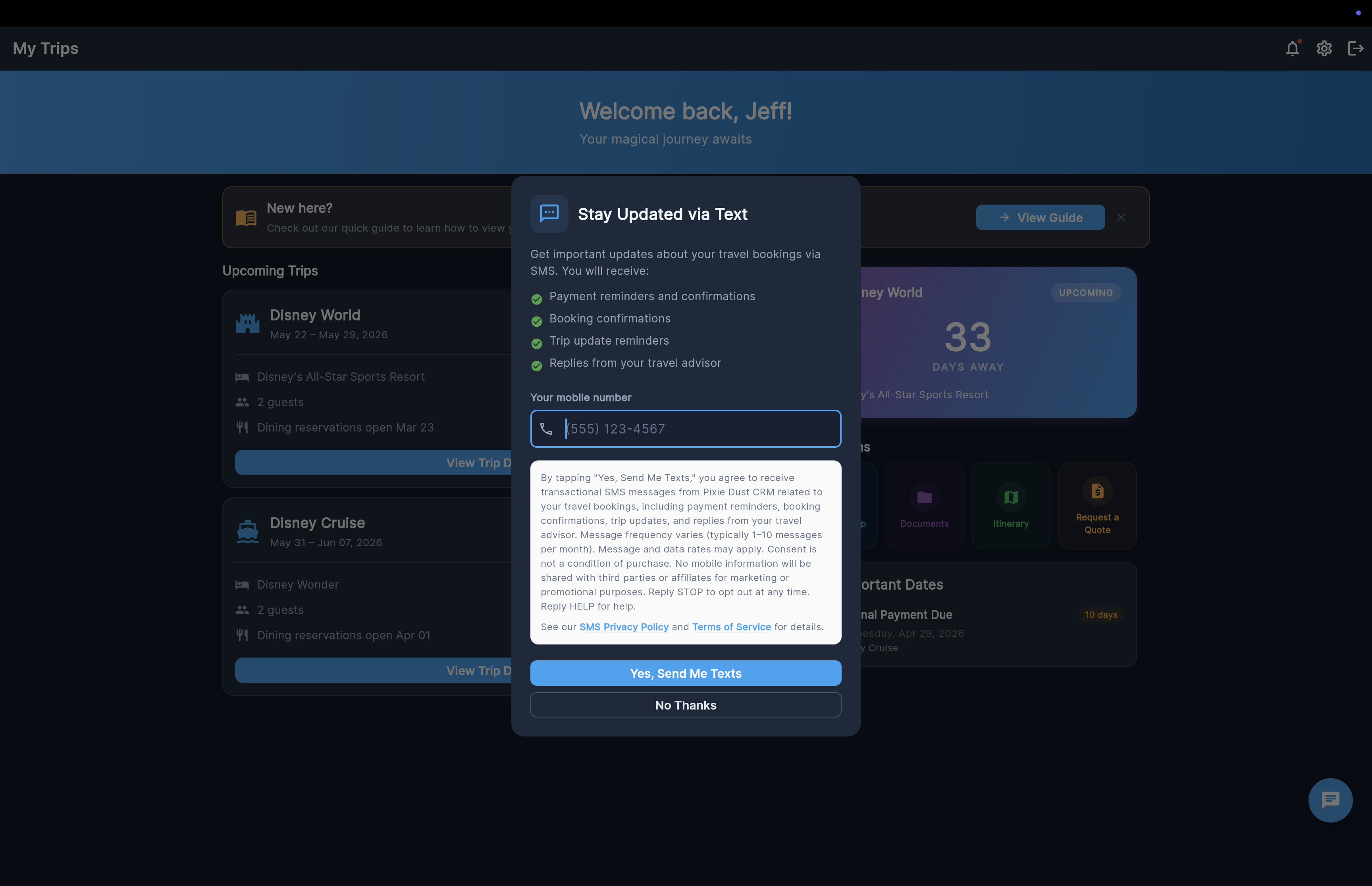 - In-app opt-in prompt: When you first log in to the Pixie Dust CRM client app and your travel advisor has SMS messaging enabled, you will be shown an opt-in dialog titled "Stay Updated via Text." This dialog explains the types of messages you will receive, displays our SMS disclosure, and provides a link to this SMS Privacy Policy. You can choose "Yes, Send Me Texts" to opt in or "No Thanks" to decline. If you decline, the dialog will not be shown again and you will not receive SMS messages.